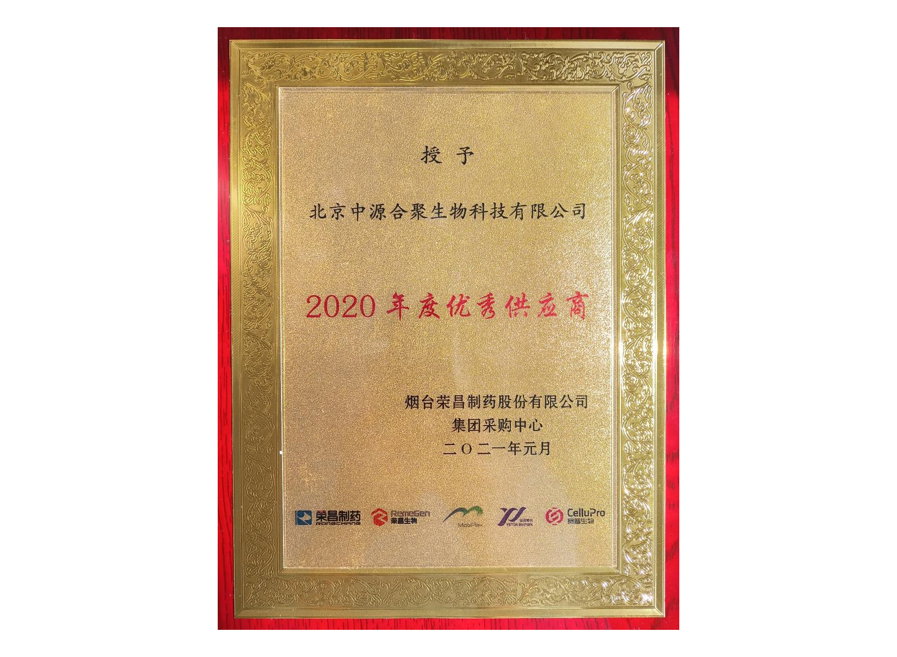 热烈祝贺中源公司喜获荣昌生物2020年度优秀供应商。2021-03-09 09:16:00.0
