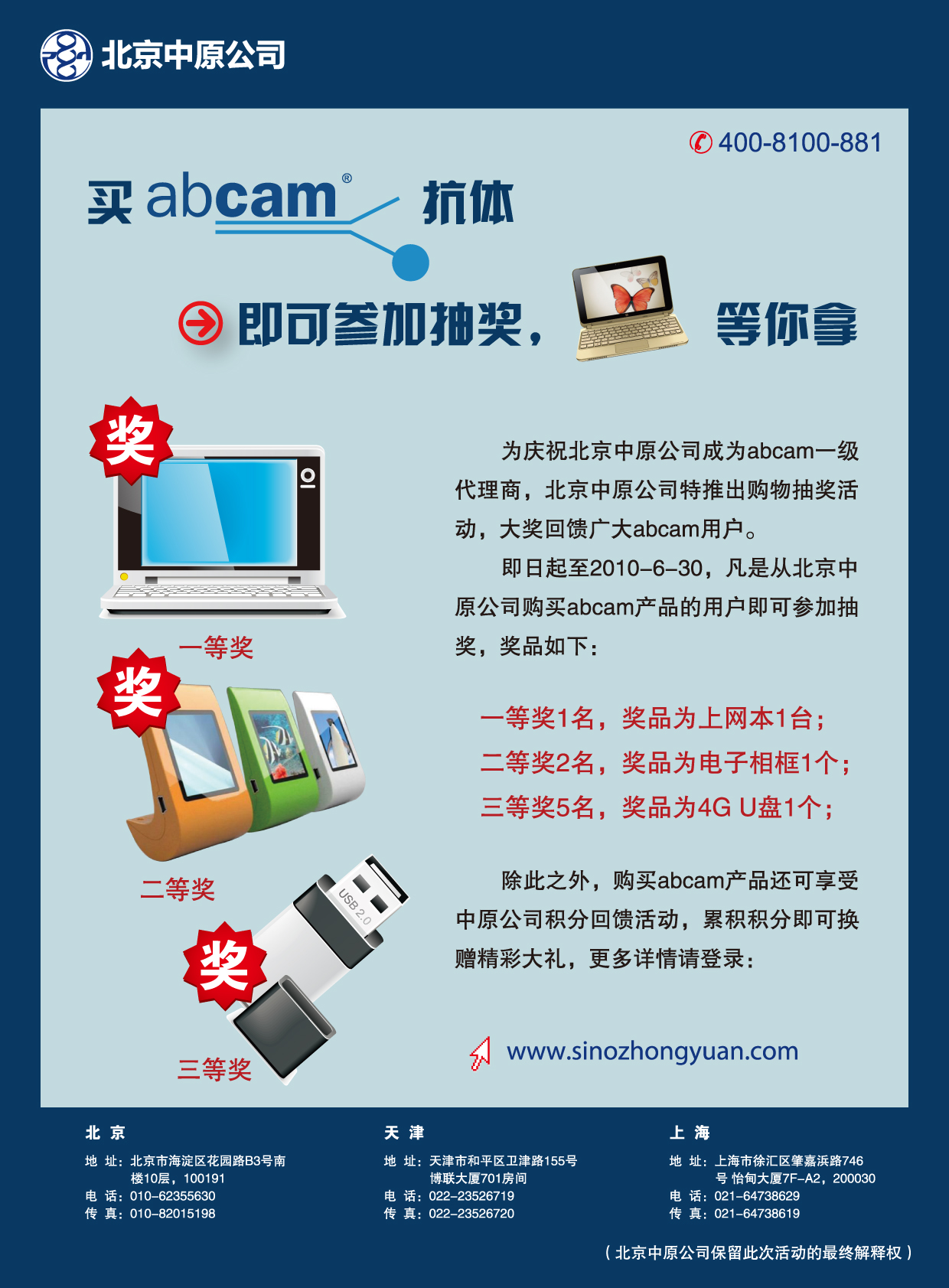 为庆祝北京中原公司成为abcam一级代理商,特推出购物抽奖活动回馈广大用户。此次活动的获奖名单是: