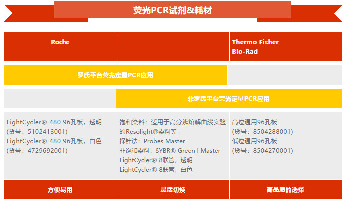 LightCycler® 480试剂,无论是基于荧光染料法、水解探针法的定量检测,还是基于高分辨熔解曲线的基因分型,都可在实时定量PCR中获得高扩增效率和高质量荧光信号,定量/定性结果精确度高。