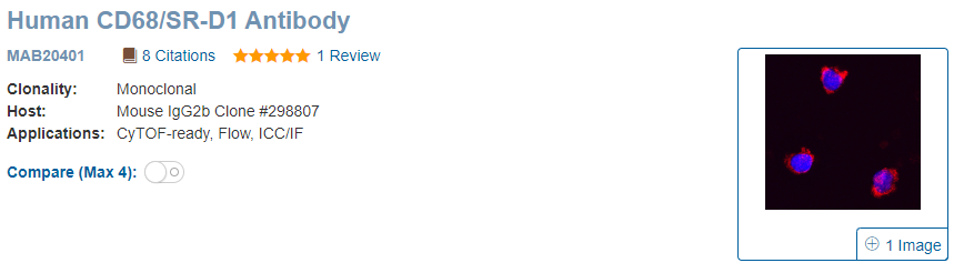例如,巨噬细胞标志物 CD68(货号 MAB20401)抗体,应用栏中仅标出了 ICC/IF,虽然不能确定一种抗体在每一种组织中都有同样的表现,但我们可以证明其对固定抗原的识别,所以也可应用于 IHC 实验。
