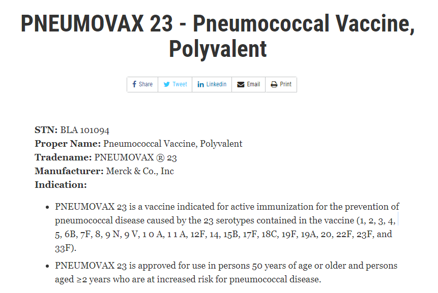 由于荚膜多糖在肺炎球菌致病性中的重要作用,它已成为许多血清型特异性疫苗的成分。1983年,Merck研制了一种23价肺炎多糖疫苗(PPV23,肺炎球菌23;Merck),该疫苗含有从23种不同血清型中纯化的荚膜多糖。由于婴儿免疫系统发育不完全,PPV23未被批准用于2岁以下儿童。