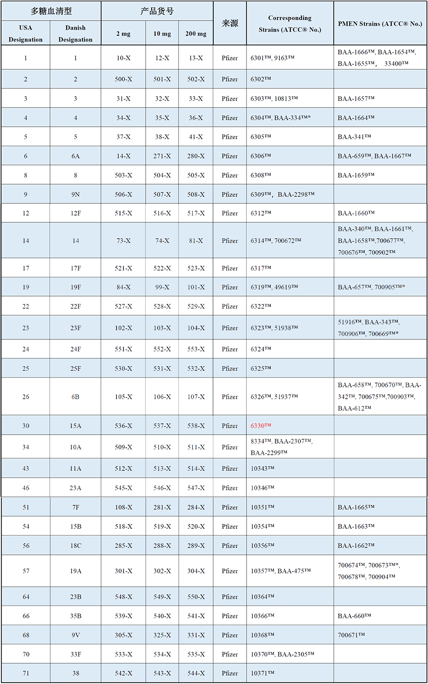 注释:1、美国以抗原被鉴定的时间顺序对不同亚型的肺炎链球菌多糖进行命名,目前已鉴定出90个血清型,依次命名为:123……902、丹麦则依据抗原的相似性命名,使用字母+数字系统来表示任何已知的交叉反应性。数字代表血清包膜抗原,字母代表不能区分的相关血清型,将最先发现者称为FFirst,其后发现者为ABC等。3ATCC不再接收产自Merck的多糖。
