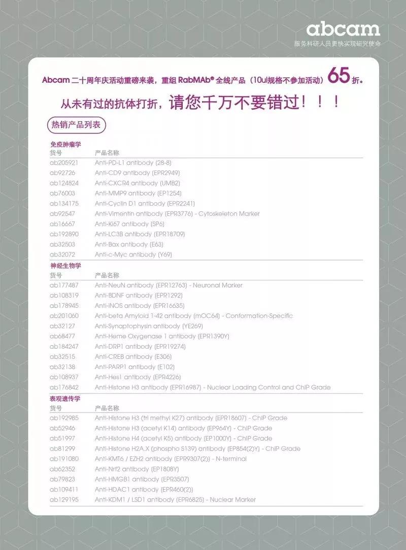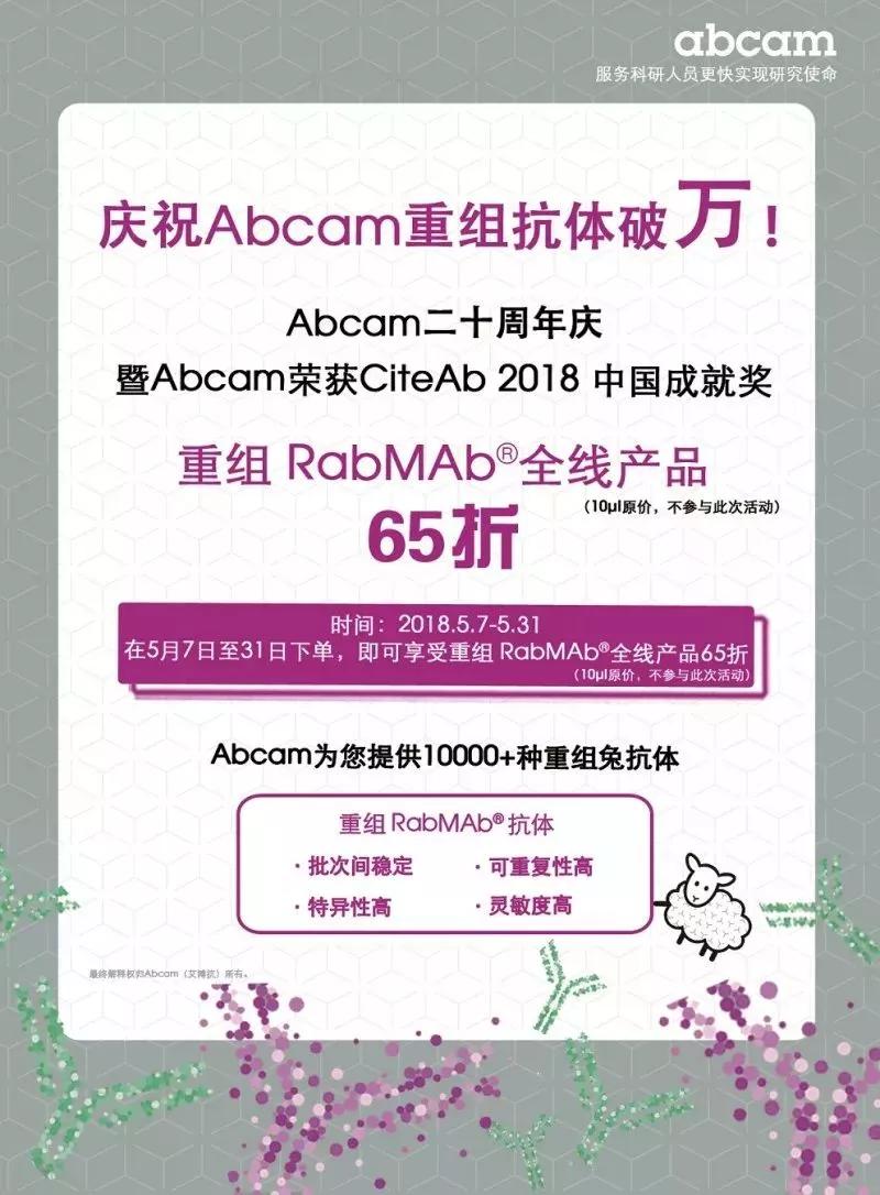 Abcam二十周年庆第二波活动重磅来袭,为回馈长期支持Abcam的新老用户,重组RabMAb®(abcam专利兔单抗)全线产品,低至65折(小包装10ul除外)!降幅前所未有!助力加速您的科研发现!