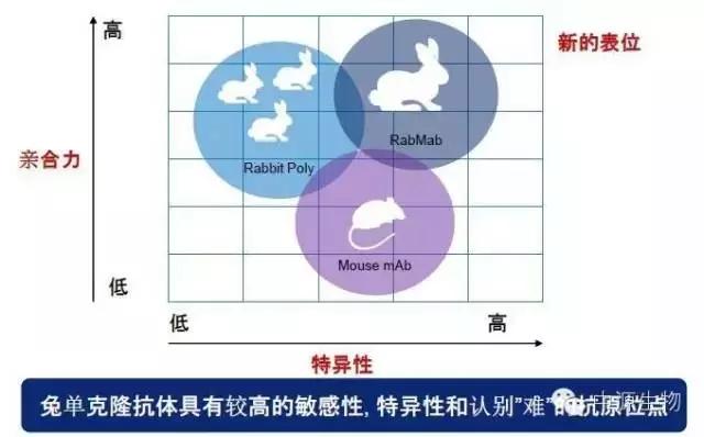 兔免疫系统的亲和力优化机制比小鼠和其他啮齿动物更有效。可利用兔产生这些高亲和力的抗体,甚至是针对在小鼠中不具有免疫原性的抗原也能产生抗体。平均而言,兔单克隆抗体对靶抗原的亲和力是小鼠单克隆抗体的10-100倍