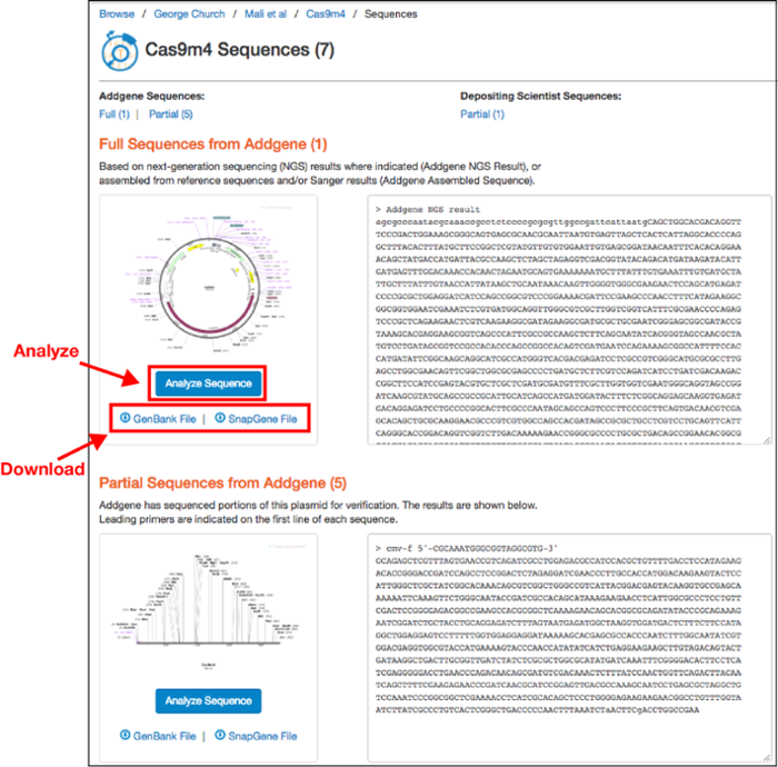 一旦你确定了一个想更深入了解的质粒,我们升级后的序列分析软件将方便你深入细节的去了解。点击“查看所有序列”按钮,你可以发现来自质粒原始提供者和Addgene自己的测序结果的可用序列信息: