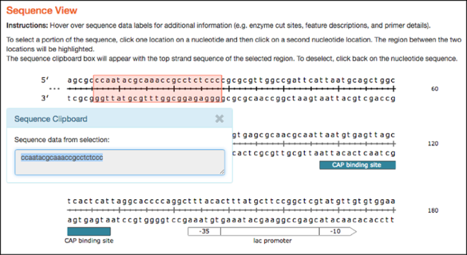 这是你点击“分析序列”按钮后的第一个标签。这里所呈现的图谱保留了上面讨论的静态地图中的所有特性,但也具有交互功能。您现在可以停留在任何特征,酶,引物,或ORF上,以了解更多有关质粒的信息。例如,如果你停在氨苄青霉素抗性基因上,你会发现基因的全名,基因产物的名称,以及它功能的描述。您还可以单击质粒中的一个位置,然后再单击第二个位置,即可选择两个位置之间的序列,并将其发送到剪贴板以便进行复制和粘贴功能。