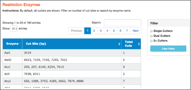 在这里你会找到一个可以切割给定序列的限制酶的列表。该表包括:酶的名称,酶切的位置(碱基对),及酶切的总次数。使用右边的过滤器可以查找单、双和3个酶切的酶。还可以通过单击列头将酶进行排序。点击特定的限制酶也会在“map”和“序列”选项卡中突出显示它。