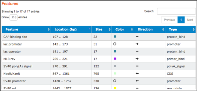这里列出的表列出了序列中检测到的质粒共同特征。表格中包括特征的名称、位置、大小、在图谱上表示它们的颜色、方向(如果相关)和类型。列出的类型是GenBank标准版本的特征类型。点击这里的某个特性也可以在“map”和“序列”选项卡中突出显示该特征。