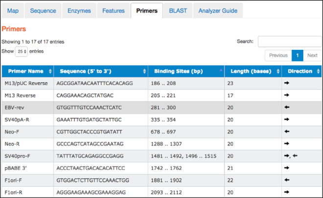 此表包含一个在给定核苷酸序列中检测到的常用引物的列表。表格中包括引物的名称、序列、结合位点、长度和方向。点击一个特定的引物将在“图谱”和“序列”标签中突出显示。