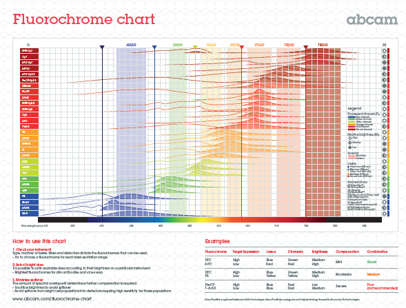 · 对应于 30 种最常用流式细胞术荧光染料(包括串联染料)的发射和激发光谱;