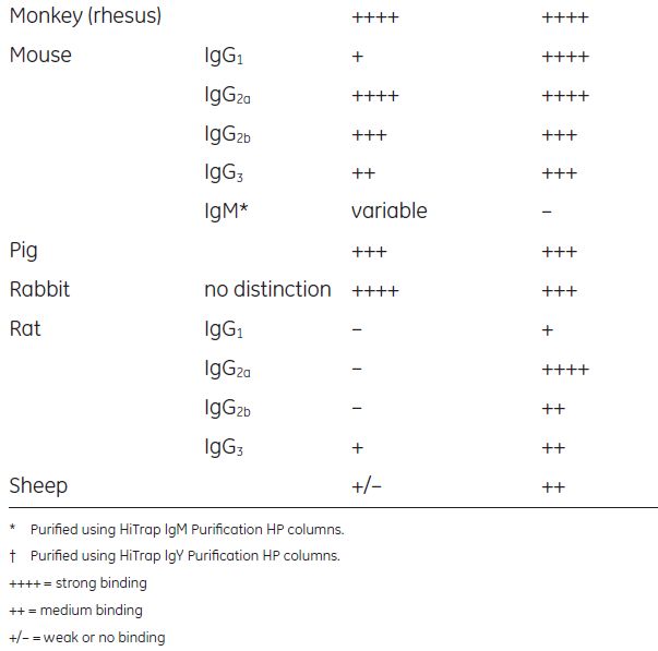 蛋白A和蛋白G对于不同种属和不同亚型的抗体结合能力差异如下表所示,蛋白A对兔来源抗体的亲和力较高,蛋白G对于小鼠等部分哺乳动物抗体的亲和力较高。