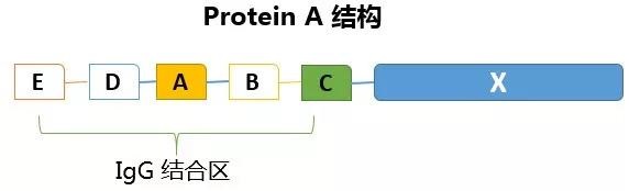 20世纪中期,Jensen发现有一种蛋白可以与人和兔血清抗体广泛结合,该蛋白于1964年首次被称为Protein A。 Protein A是一种金黄色葡萄球菌细胞壁蛋白质,分子量42KD,它能够特异性地结合多种免疫球蛋白的Fc区段而与Fab区或轻链结合很弱。天然的Protein A有5个IgG结合结构域和未知功能的非Fc结合域,结构示意图如下: