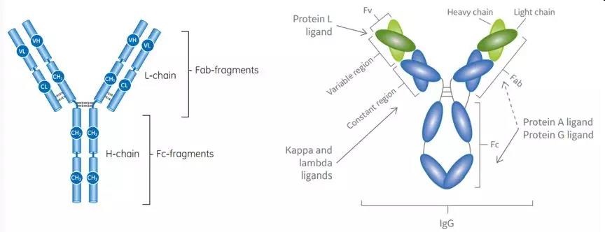 蛋白G来自于链球菌G族的细胞表面蛋白,是III型Fc受体,分子量为25KD,其通过类似于蛋白A的非免疫机制而结合抗体的Fc段,蛋白G与蛋白A均可结合抗体的Fc段,不同的是,蛋白G还能结合Fab段,且蛋白G可以更广泛的结合更多类型的IgG分子,多克隆IgG分子,同时蛋白G与血清蛋白结合水平低,产物纯度高,且配基脱落更低。抗体基本结构和蛋白A/G的结合位点如下图所示: