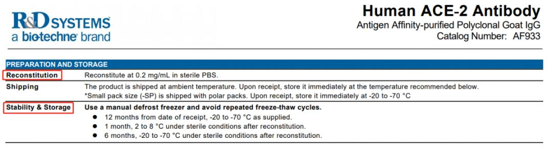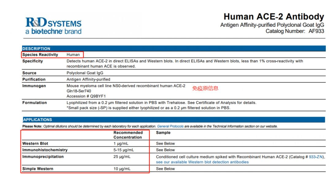 以新型冠状病毒入侵人体门户的关键靶点 ACE-2 的抗体(货号:AF933)为例,予以说明: