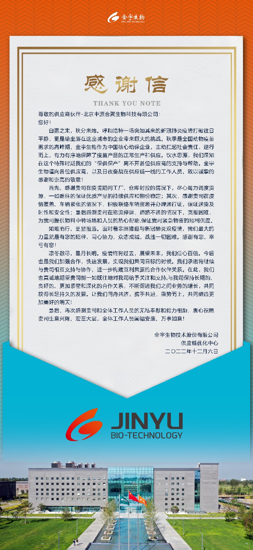 以下为金宇生物感谢信全文: