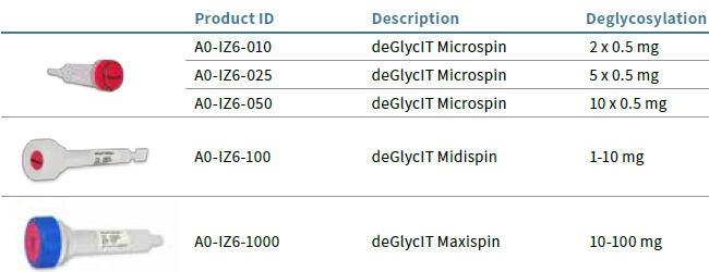 deGlycIT是固定在琼脂糖上的IgGZERO,可以快速和选择性去除Fc上的N-聚糖。提供的离心柱预先填充有固定化IgGZERO,可用于少量甚至高达数百mg抗体的去糖基化。