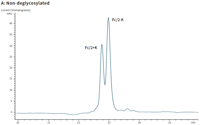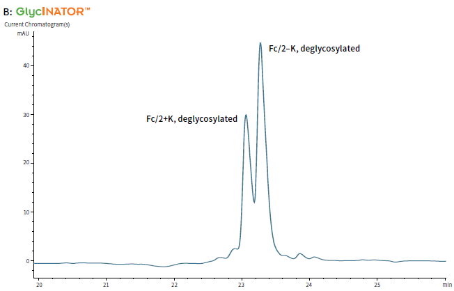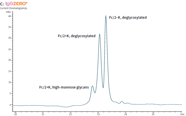 The removal of glycans on Fc is seen as a shift in retention time in reversed phase chromatography. Chromatogram A: Fc with intactN-glycans, Chromatogram B: IgG deglycosylated with GlycINATOR, Chromatogram C: IgG deglycosylated with IgGZERO.