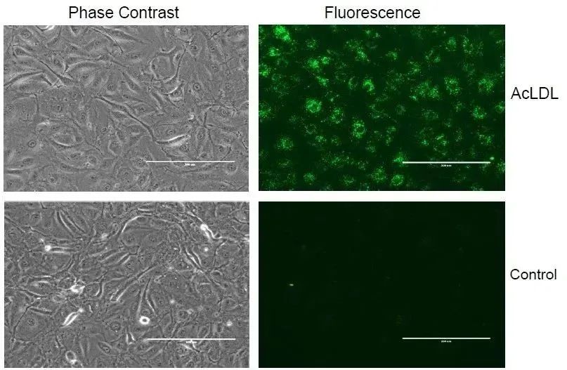 图3:HPAEC-BMI1细胞对AcLDL的摄取。细胞在四孔室载玻片上培养,并与Alexa Fluor 488 AcLDL一起孵育4小时。之后,用培养基洗涤细胞,然后在培养基中,在GFP荧光和透射光下使用EVOS荧光显微镜观察和拍照。不含Alexa Fluor 488 AcLDL的培养基中的细胞用作空白对照