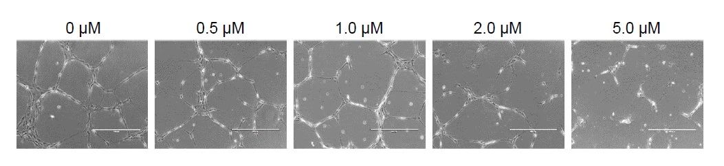 图4:舒尼替尼抑制HPAEC-BMI1细胞毛细血管样管的形成。血管形成测定在24孔板中进行。将在含有0、0.5、1.0、2.0和5.0 μM舒尼替尼(Sigma,#PZ0012)的培养基中的细胞接种到基底膜基质上(细胞基底膜;ATCC ACS-3035™)。在37°C下孵育24小时后,使用EVOS荧光显微镜在透射光下观察并拍摄毛细管状管。